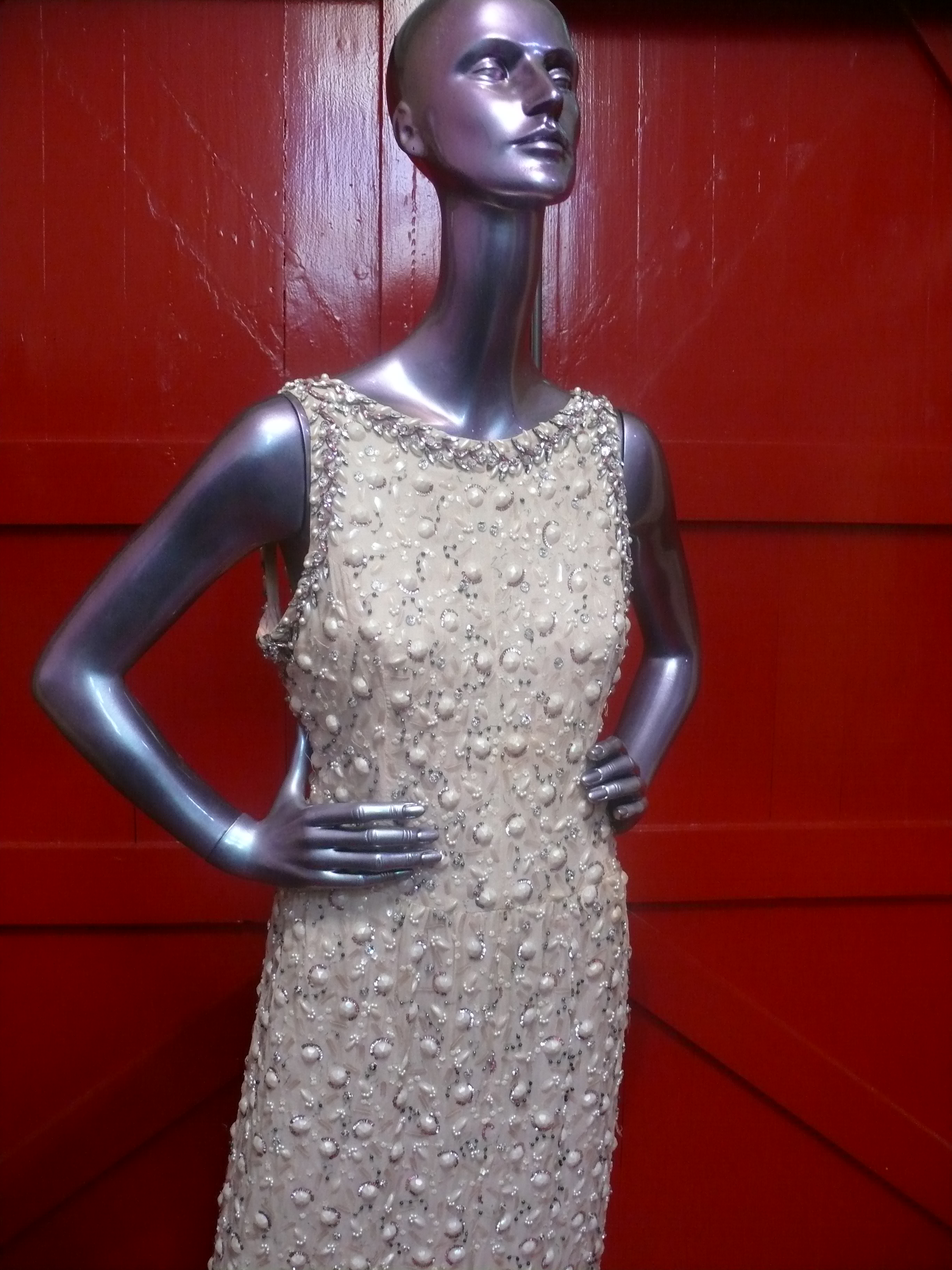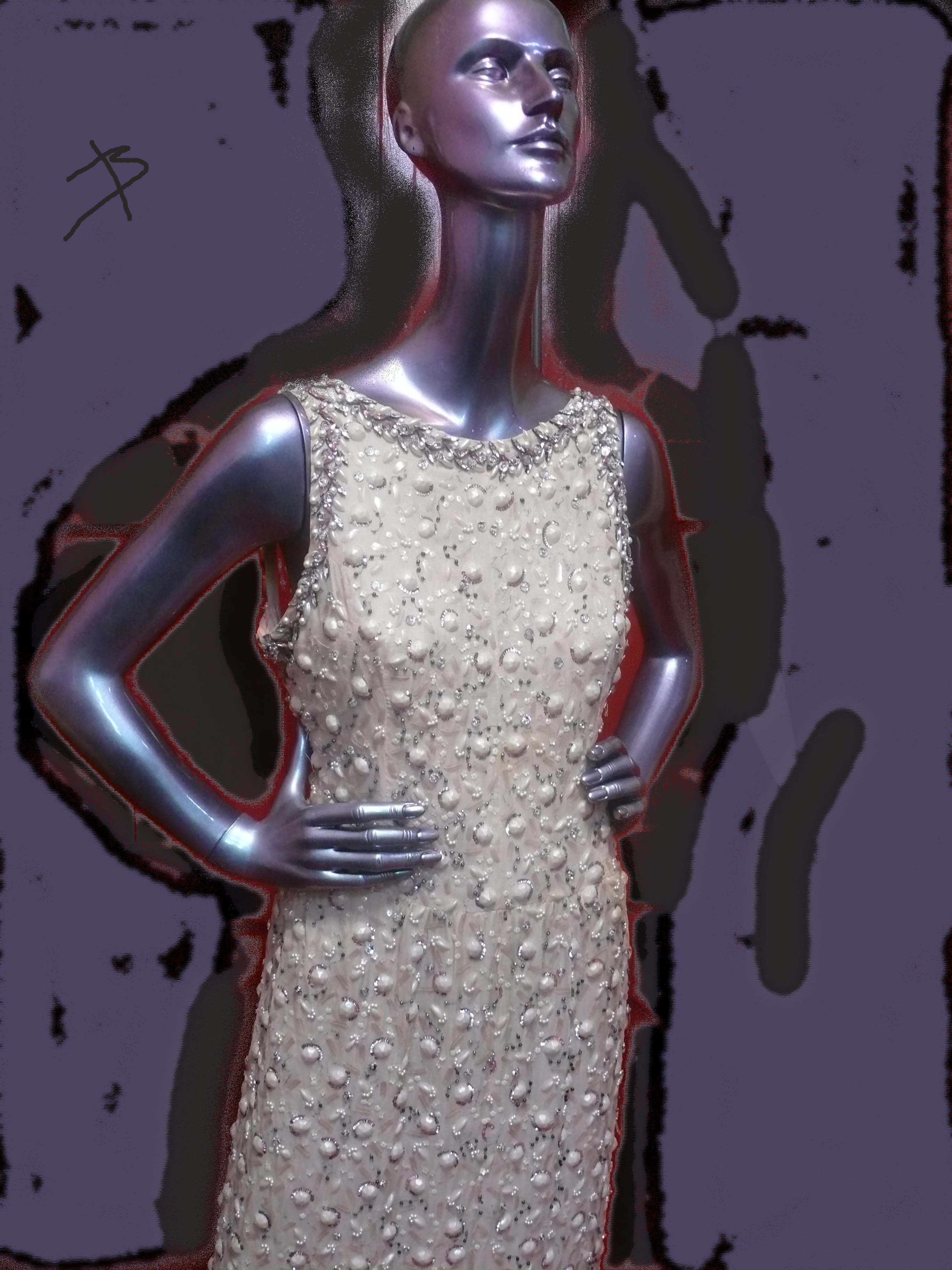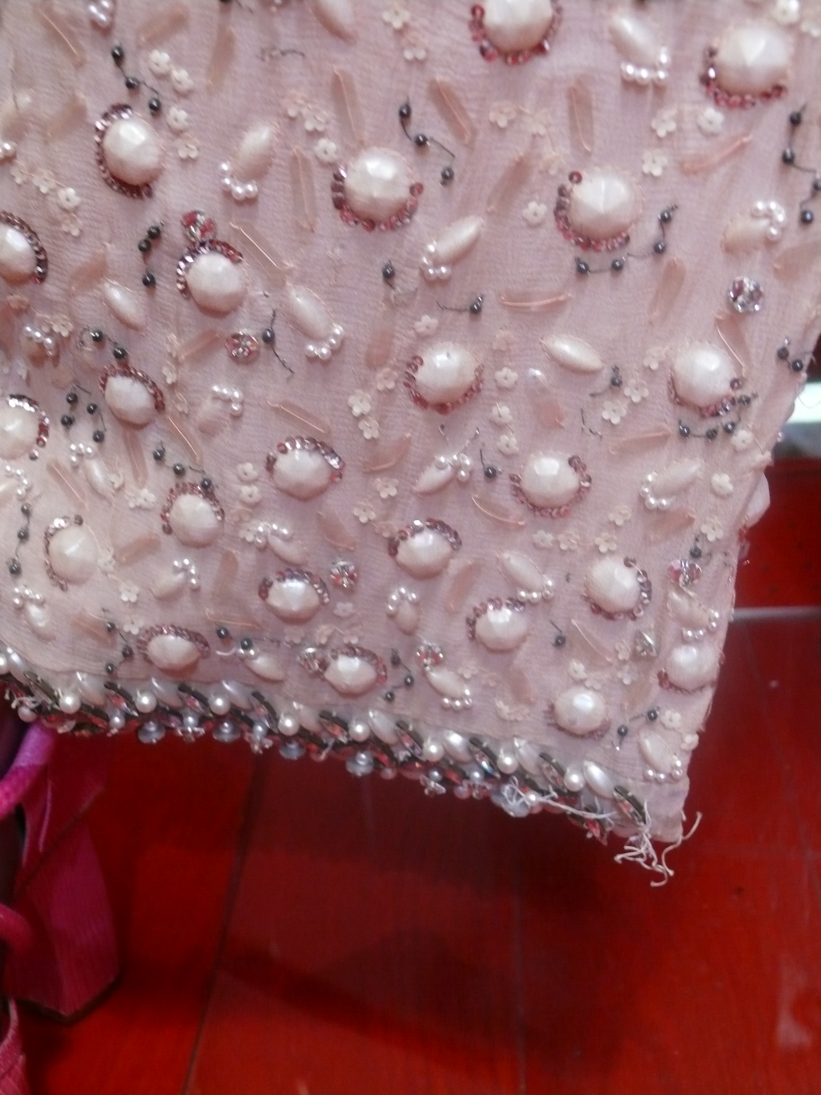 Vestido de noche largo creado en 1965 casa BALENCIAGA París ,en color rosa palo con incrustaciones de pailletes, cristal de strass y botón de nacar entremezclado entre las telas para dar la sensación de botones forrados y contribuir a crear un tejido tridimensional con fuerza propia