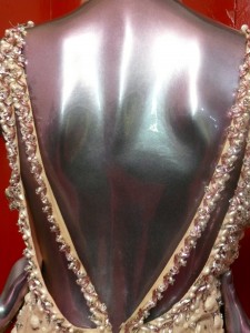 Para la catalogación especial de este vestido se ha tenido en cuenta las costuras del bajo ,las cuales están íntegramente cosidas a mano, ya que el tejido no permite el acceso de máquina de coser , por estar compuesto de varios adornos, además, en alta costura , es una característica importante , que los bajos estén realizados a mano y muchas veces con puntada invisible , que hace que prácticamente no se note el cosido.